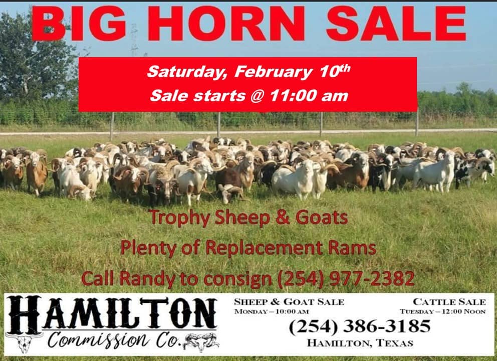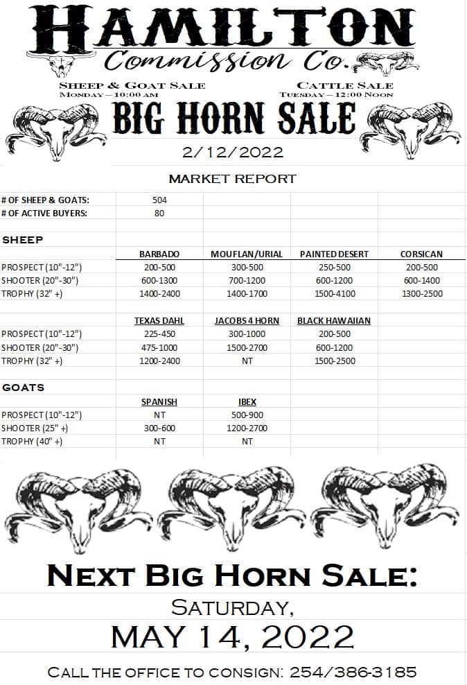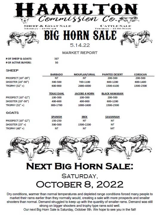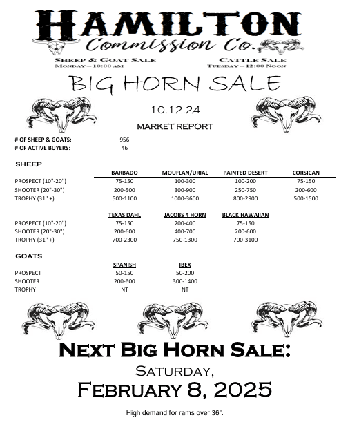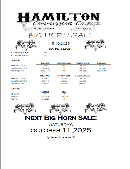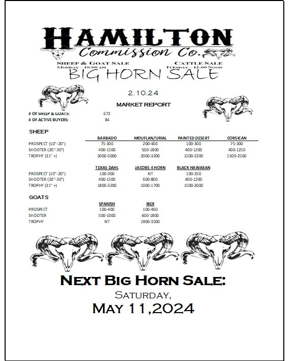 ![May be an image of text that says 'HAMILTON CΏ. Commission ያዊ. SHEEP & GOAT SALE CATTLESALE CATTLES 10:00AM TUESDA NOON BIG HORN SALE 2.11.23 MARKET REPORT #O OF SHEEP GOATS: ACTIVE BUYERS: 596 74 SHEEP BARBADO (20"-30" -30") TROPHY TROPHY(32"+) MOUFLAN/URIAL 275-700 BDD-1100 PAINTED DESERT 100-450 100-450 350-1100 1300-2000 CORSICAN 800-2450 PROSPECT '-12"1 SHOOTER(20*30") 30") TEXAS DAHL 300-800 900-1500 JACOBS4HORN 300-850 1000-3300 GOATS BLACKHAWAIIAN 250-1250 350-350 75D-1550 SPANISH PROSPECT (10"-12"] R(25" TROPHY TROPHY(40*+) (40" 125-180 250-350 NT NT NEXT BIG HORN SALE: SATURDAY, MAY 2023'](https://scontent-dfw5-1.xx.fbcdn.net/v/t39.30808-6/330221069_917422869390460_8350070374226735173_n.jpg?stp=cp6_dst-jpg&_nc_cat=101&ccb=1-7&_nc_sid=8bfeb9&_nc_ohc=_PWZrJipNmgAX8EdOuv&_nc_ht=scontent-dfw5-1.xx&oh=00_AfDNe9l4TALImVlLe3FdrBV8O3z1_CzZvhxkFNhwrz0B3A&oe=63F2F5E4)